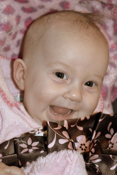 Anyway, I was thinking of hands. Betty is 12 weeks old. She just discovered her hands and likes to look at them and twirl them together. She also found out that her two fingers taste best tucked into her mouth, and she keeps herself entertained for a long time. She started inflecting her little voice into squeals and giggles. She doesn’t just smile. She hunches her tiny shoulders all the way up to her ears, tilts her head to the side, and gives a full-out grin.