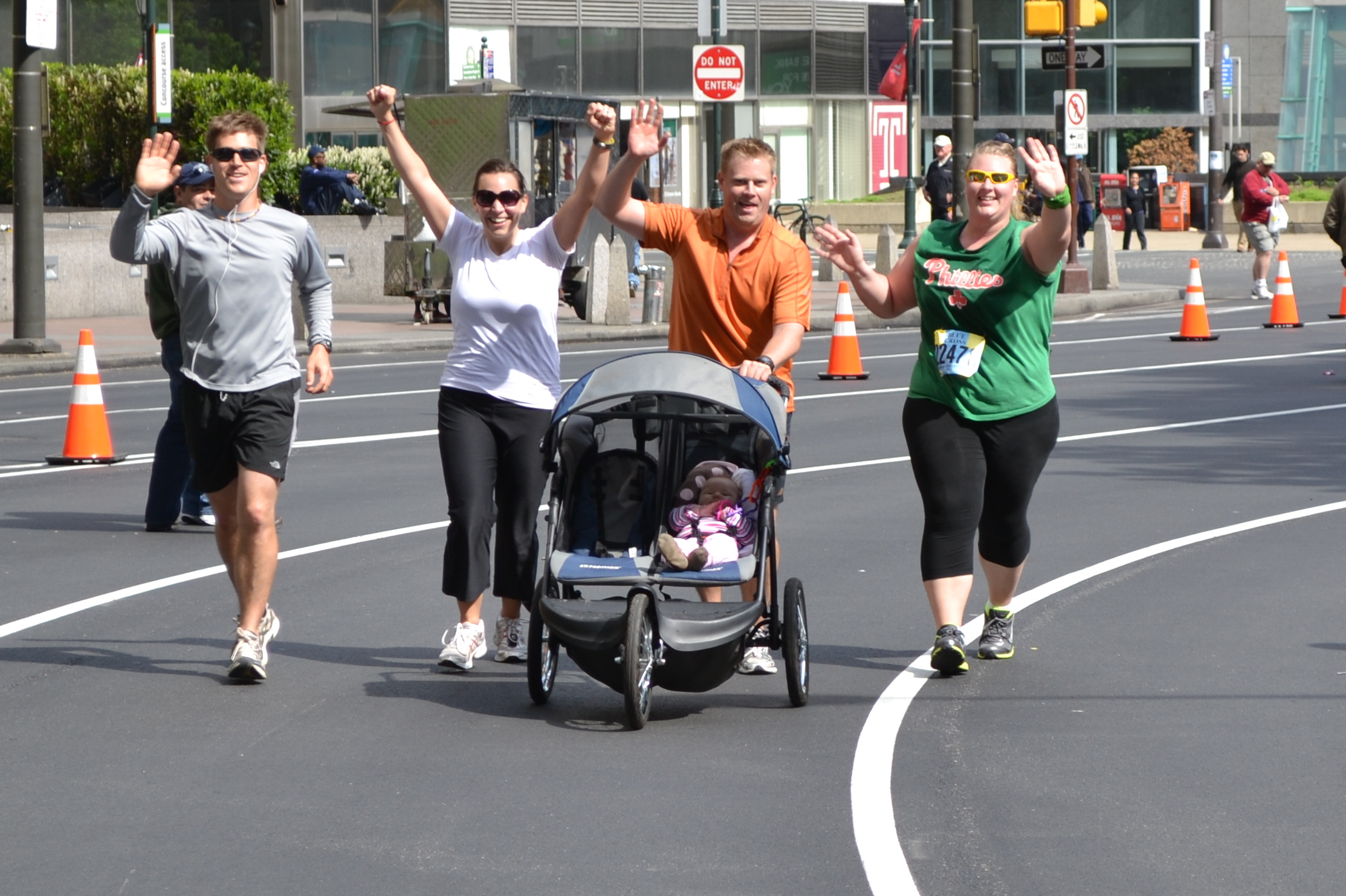 The day before the run my friend Ashley called me and it worked out that she met us and ended up running with me the whole way. Then Matthew, Heidi, Will & Rebecca ran together. I honestly just wanted to finish. I thought it would be cool if I didn’t stop running, but wasn’t counting on being able to do that. It was so encouraging to have a friend to run with, and we talked for the first 7 miles. At mile 4 we swung into a McDonalds to use the bathroom (since the porta-potty situation at the start line is pretty insane). Other than that stop, I ran the whole way. Around the 6 mile mark there are crowds and crowds of people cheering you on, and lots of kids saying, “Go, Mom!” Former Governor and Mayor, Ed Rendell, was there on the side of the street and I gave him a high five. My first brush with fame. Then, after 7 miles I told Ashely I wanted to quit. My legs were feeling cramped up and I was tired of hitting the pavement. There’s a stretch between 7 and 9 miles that is really hard. I put my music on and tried to think enduring thoughts.