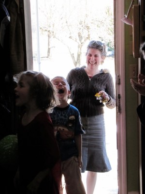 Today was my birthday, and it was truly a special day. All week, the moment I sink into the driver’s seat before going somewhere, the kids have broken out into a hearty rendition of “Happy Birthday”. I’ve felt the excitement growing. I love birthdays. Then this morning it arrived! I woke up and was served a delicious waffle and hot tea by my husband. He took the entire day off work just so I could have some time alone. He shooed me out of the house and I perused thrift stores and had lunch at my favorite cafe with a good book to keep me company. I perused more thrift stores and didn’t feel the rush of people needing me. The press to answer questions and solve problems was lifted for a few glorious hours. Notes, messages, a few cards and lots of love was poured out today. Matthew took the kids out on a mystery trip and came home with something I’ve always wanted but would never buy for myself: a glass tea-pot and flowering tea. Nadine mopped the floors for me. Then, I invited some girl friends over for some much-needed hang-out time. When my sister arrived, she said she brought one more thing with her. Thinking she forgot something in the car, I just about fainted when my other New York State-dwelling sister popped out from around the corner! What a delight to see her face and laugh our guts out all together. I’m so bummed I never asked my fabulous photographer friend to take a picture of us sisters together. But, here is a snapshot of my day in part: